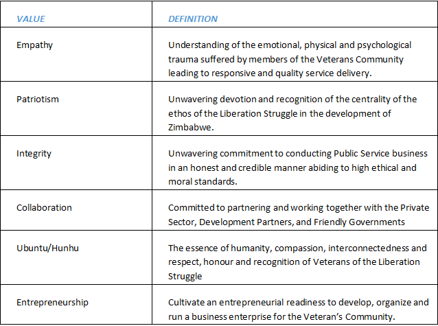 “To improve the welfare and livelihoods of the veterans of the liberation struggle community through investments promotion, capacity building, memorialisation and provision of statutory benefits thereby benchmarking our service provision to world-class standards by 2030 in which the Ministry will be pushed to heightened standards of inclusive socio-economic development for its clients, the veterans of the liberation struggle community”